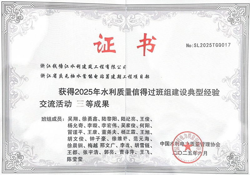 近日,中國(guó)水利電力質(zhì)量管理協(xié)會(huì)公布2025年度水利質(zhì)量信得過(guò)班組建設(shè)典型經(jīng)驗(yàn)交流活動(dòng)評(píng)選結(jié)果,慶元抽蓄籌建期EPC總承包項(xiàng)目憑借扎實(shí)有效的質(zhì)量管理實(shí)踐和突出的建設(shè)成果,榮獲“2025年水利質(zhì)量信得過(guò)班組建設(shè)典型經(jīng)驗(yàn)交流活動(dòng)”三等成果。這一榮譽(yù)不僅為“浙錢水建”品牌再添光彩,更標(biāo)志著公司在工程質(zhì)量管理領(lǐng)域獲得了行業(yè)權(quán)威機(jī)構(gòu)的高度認(rèn)可。